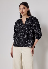 Blouse noire avec un motif à pois blancs, en tissu léger, décolleté en V, patte de boutonnage et manches longues avec poignets élastiques.