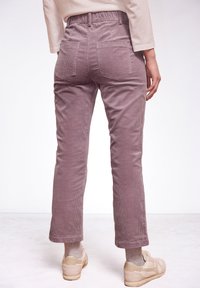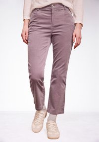 Personne portant un pantalon en velours côtelé mauve, des baskets beiges et des chaussettes de couleur claire sur un fond blanc uni.