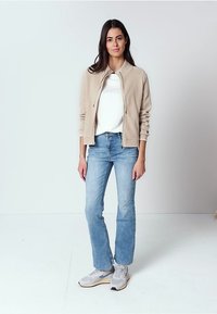 Femme portant une veste beige zippée avec cordons sur une chemise blanche et un jean bleu clair, debout devant un fond gris clair uni.