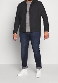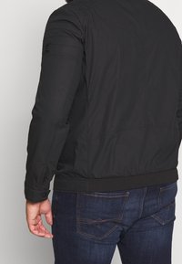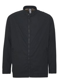 Veste noire zippée avec col montant, manches longues et poches latérales. Conçue dans un tissu lisse, avec des coutures discrètes.