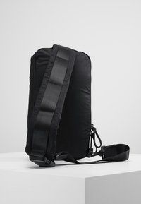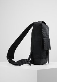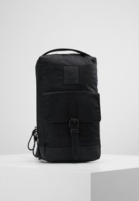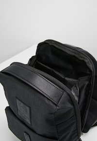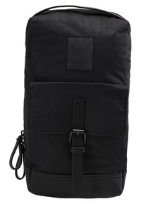 Sac à dos noir avec un corps en tissu texturé, une poche avant sécurisée par une sangle et une base plate ; présente un patch de marque sur le devant.