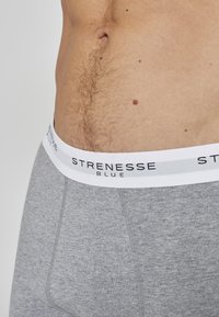 Boxer en coton blanc avec une coupe ajustée, doté d'une ceinture élastique avec le nom de la marque "STRENESSE" en lettres noires.