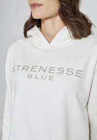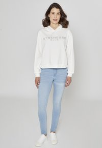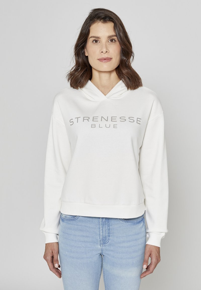 Hoodie blanc court avec un col en V, arborant le texte "STRENESSE BLUE" en gris. Associé à un jean bleu clair. Texture douce.