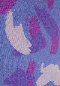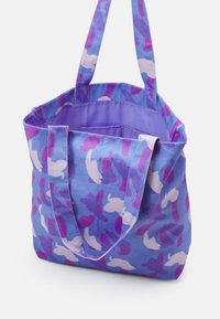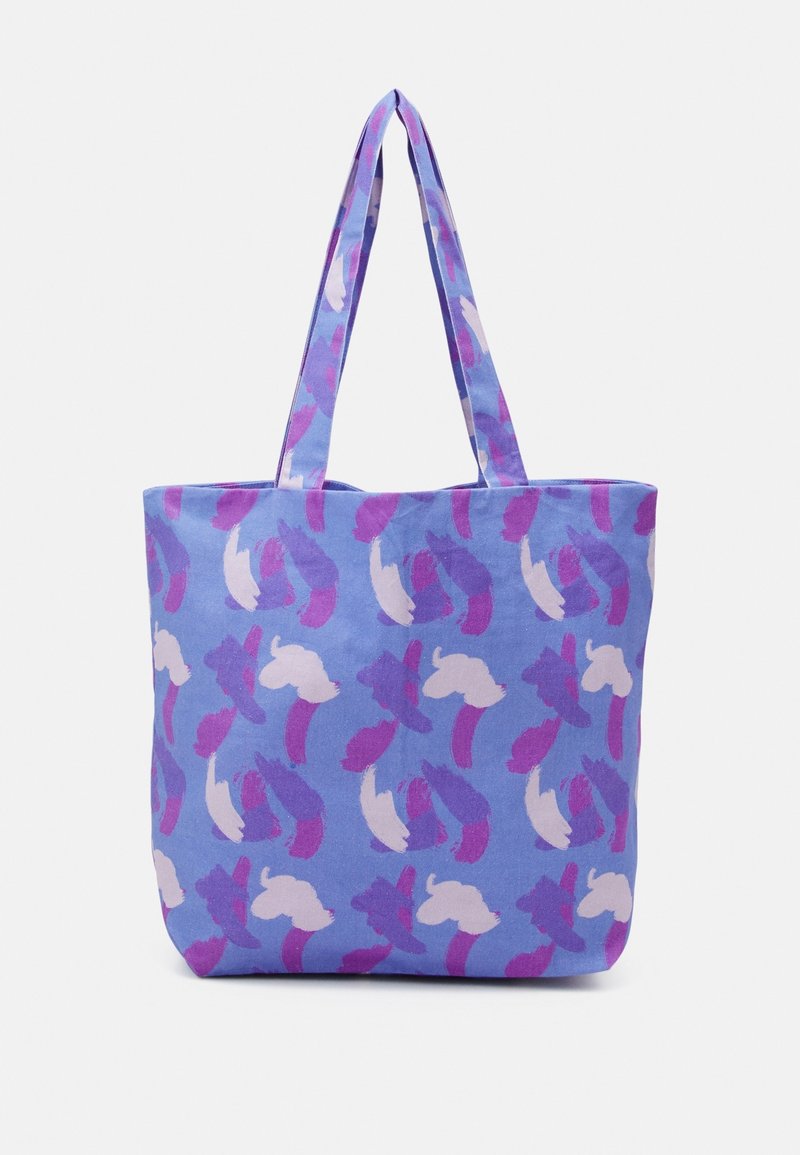 Sac fourre-tout en tissu bleu clair avec un motif abstrait en violet et blanc. Deux poignées robustes pour le transport. Design vibrant avec une texture douce.