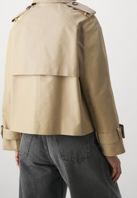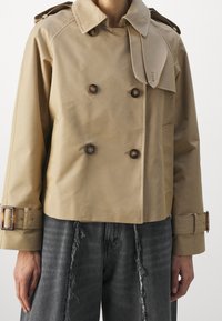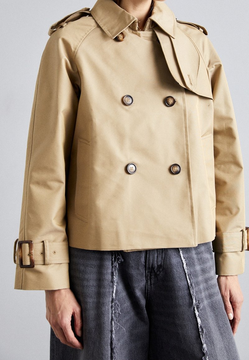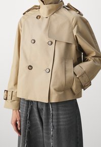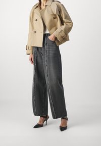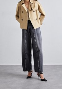 Trench-coat beige court croisé avec épaulettes, poignets bouclés, porté avec un jean gris délavé à jambes larges et usées.