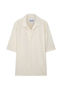 Jeune homme aux cheveux bruns courts portant une chemise noire à manches courtes et boutons, ample, sur un fond clair uni.