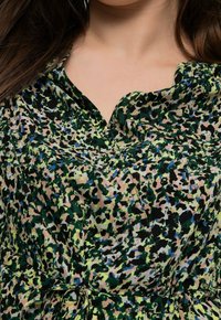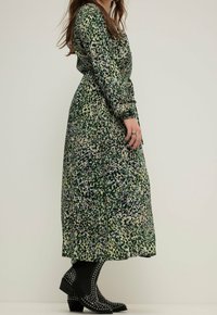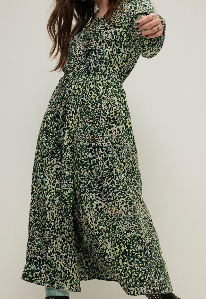 Robe longue verte avec un motif floral dans des nuances de vert, rose et bleu. Tissu léger avec une coupe décontractée et un détail de col.