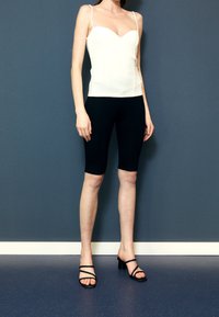 Camisole blanche ajustée avec des bretelles fines et un décolleté carré, fabriquée à partir d'un tissu lisse. Associée à un pantalon noir, présentant un design simple.