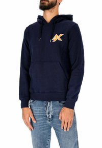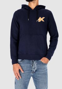 Homme portant un sweat à capuche bleu marine avec une poche avant et un logo orange sur le côté gauche de la poitrine, associé à un jean bleu clair.