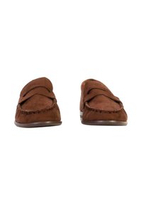 Mocassin penny en daim marron avec petit talon, surpiqûres moc toe et détail de bride sur le cou-de-pied.