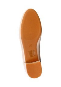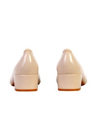 Escarpin en cuir verni beige avec petit talon carré, bout arrondi et petit nœud sur le devant.