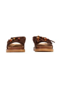 Sandale à enfiler en daim marron avec semelle plate en caoutchouc et perles décoratives multicolores sur la sangle supérieure.