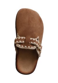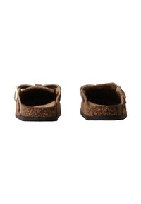 Sabot en daim marron à enfiler avec semelle en liège, boucle latérale ajustable et couture blanche décorative autour de l'ouverture.