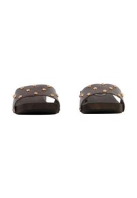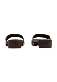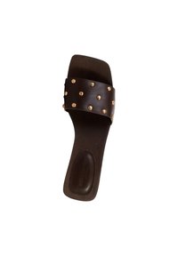 Sandale à glissière marron avec un talon carré bas, large bride ornée de clous dorés espacés de manière régulière.