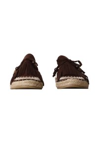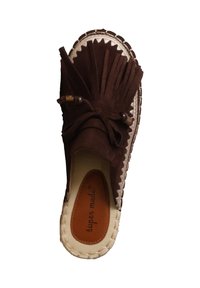 Mule marron en daim avec semelle en jute tressée et pampilles décoratives à franges sur le dessus, vue latérale sur fond blanc.
