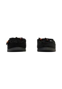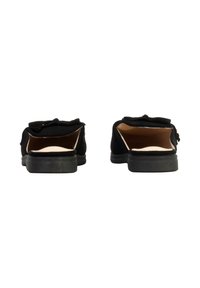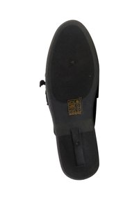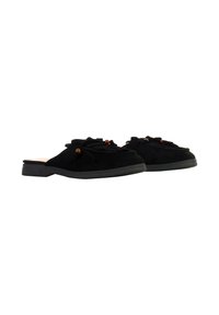 Mule plate noire à enfiler avec des ornements en pampilles et un petit talon, vue de profil sur un fond blanc.