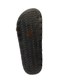 Sandale noire ouverte à l’avant type slide avec trois larges brides, dont une avec une petite boucle dorée, et une semelle plate marron.