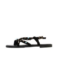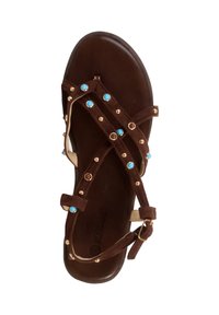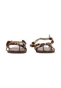 Sandale plate marron avec plusieurs brides ornées de clous bleus et dorés et une bride de cheville réglable avec boucle dorée.