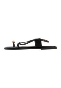 Sandale plate marron avec fines brides, boucle d'orteil avec un petit détail doré, et boucle réglable à la cheville.