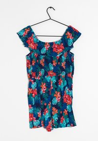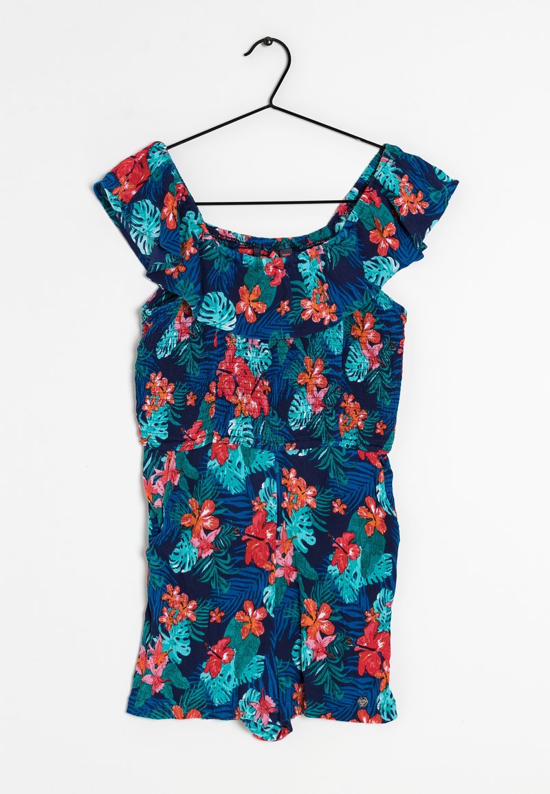 Combinaison-culotte florale avec un fond bleu marine, ornée de fleurs vibrantes roses et turquoise, des manches à volants et une taille cintrée.