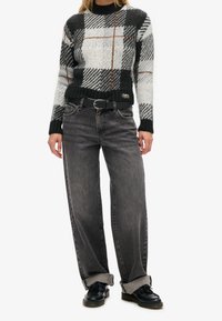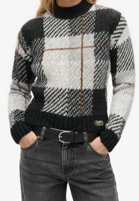 Pull en laine à carreaux noirs, blancs et gris avec des rayures marron, porté avec une ceinture noire et un jean gris foncé, les mains dans les poches.