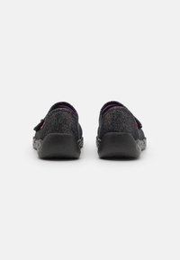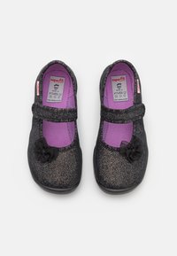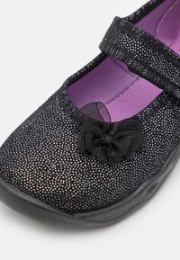 Chaussure en tissu noir avec finition scintillante, nœud décoratif et bride ajustable. Dispose d'une semelle en caoutchouc épaisse à texture ondulée. Doublée en violet.