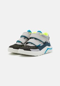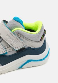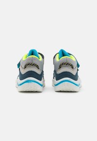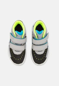 Baskets de sport grises et noires avec des accents bleu et vert fluo, des sangles Velcro et un dessus texturé ; dotées d'une semelle blanche rembourrée.
