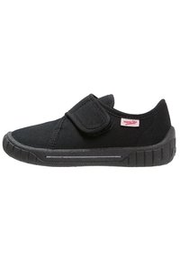 Des chaussures en toile noires avec une sangle Velcro, bout arrondi, surface texturée, semelle en caoutchouc avec des rainures, et une petite étiquette de logo rouge.