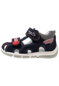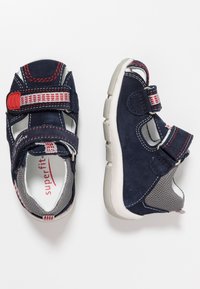 Chaussures pour enfants en daim bleu marine avec des accents en maille grise, des sangles Velcro et des détails de couture rouges. Dotées d'une semelle légère et flexible.