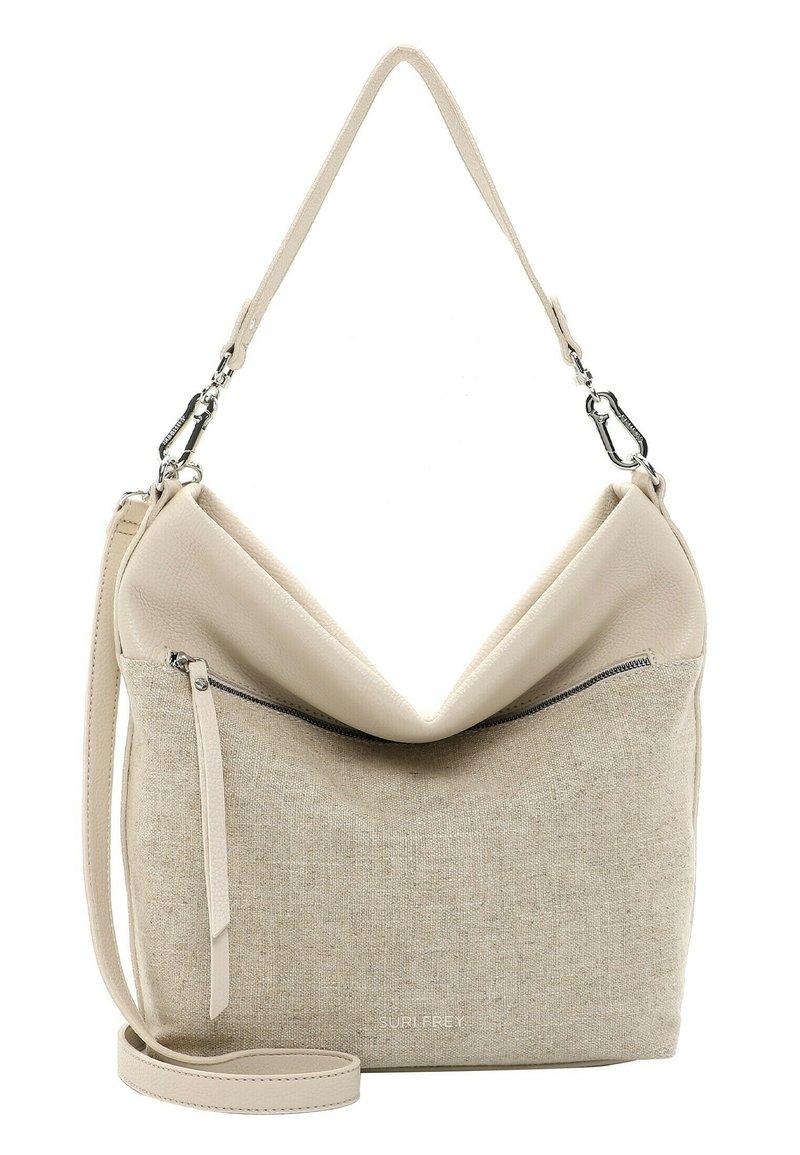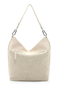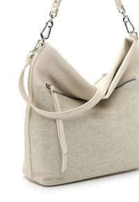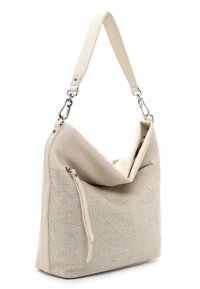 Sac à main beige avec corps en tissu texturé, rabat supérieur en cuir lisse, poche zippée à l'avant, bandoulières détachables pour épaule et porté croisé.