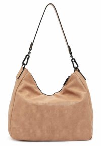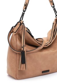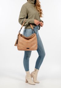 Sac bandoulière en cuir beige texturé avec un design souple, comportant un détail de pompon et une sangle ajustable, présenté avec un jean en denim clair et des bottes crème.