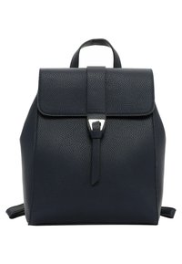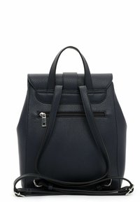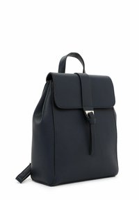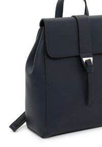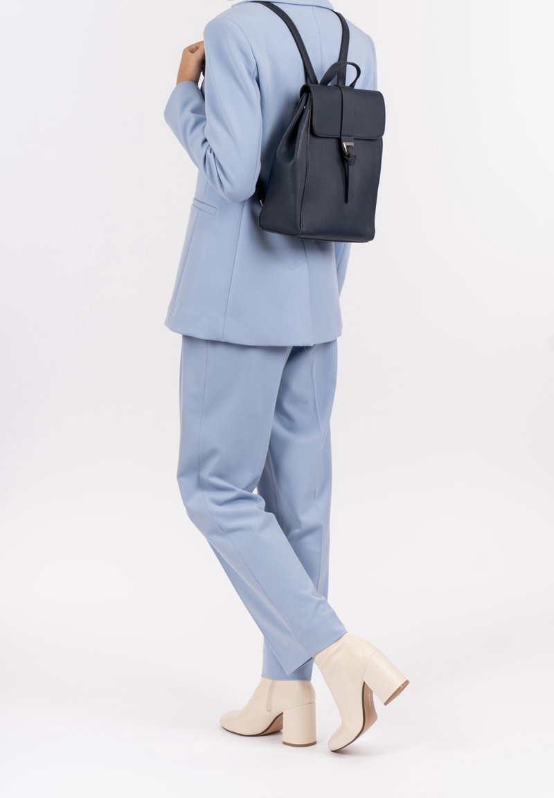 Sac à dos en cuir bleu marine avec rabat et ferrures métalliques, porté par une personne en costume bleu clair et bottines crème à talons.