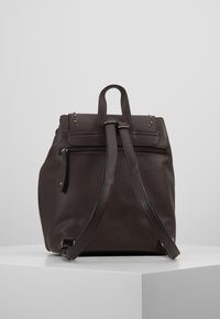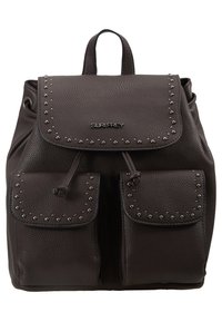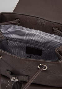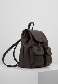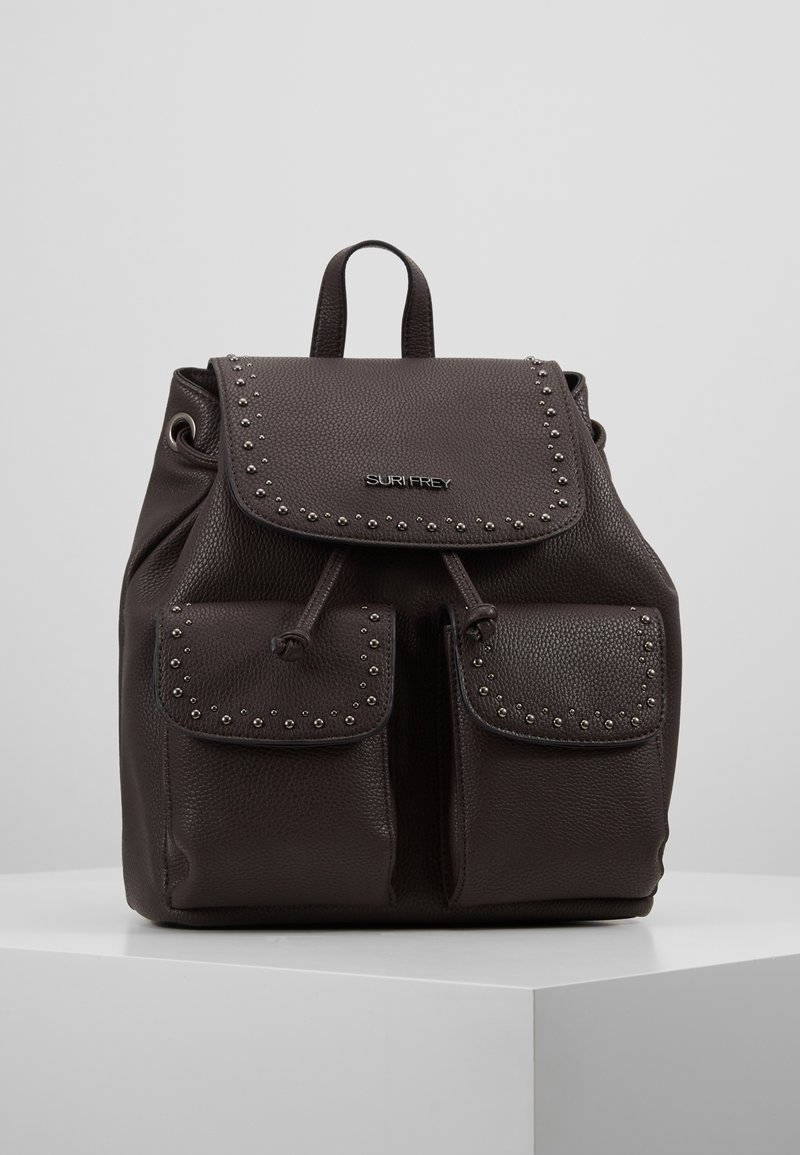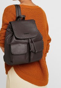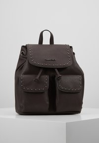 Sac à dos en cuir marron avec surface texturée, accents cloutés sur le rabat et les poches, fermeture par cordon, poignée courte et bretelles réglables.