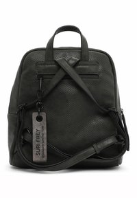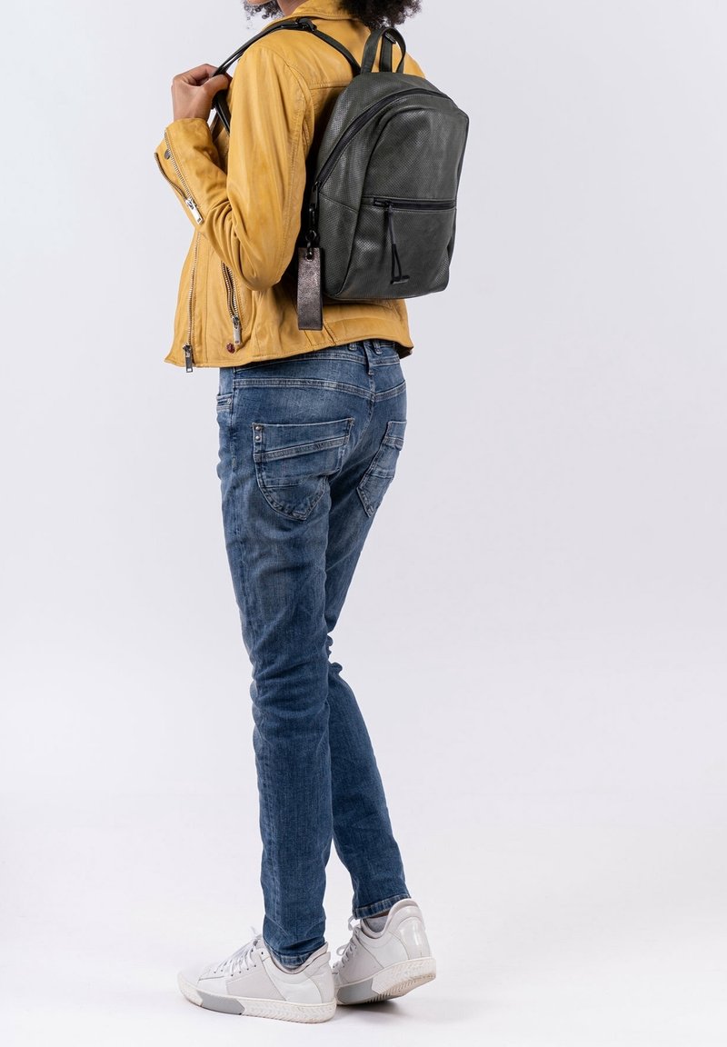Sac à dos en cuir noir avec une surface texturée, quincaillerie en argent et bretelles ajustables. Porté sur une veste jaune et un jean bleu.