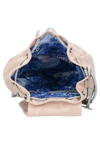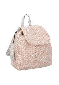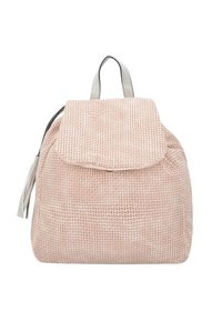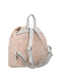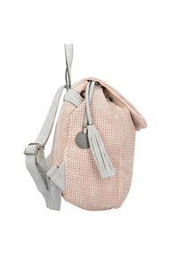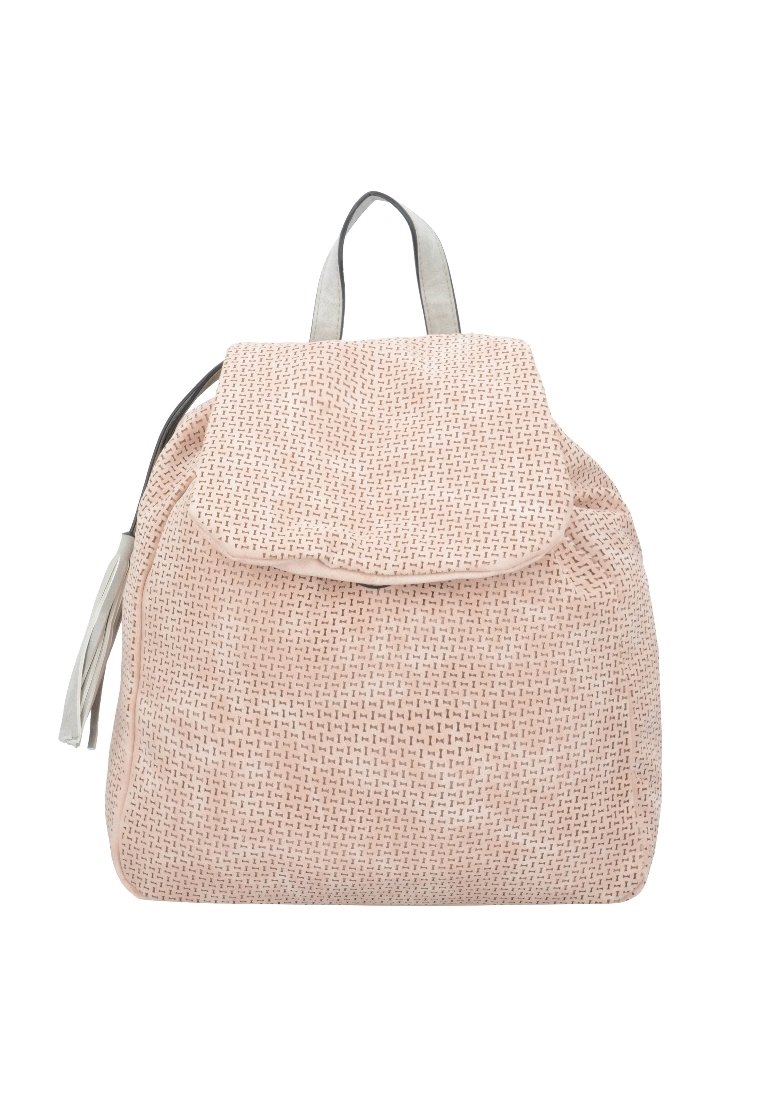 Sac à dos tissé de couleur rose blush avec une fermeture à rabat, une poignée de transport supérieure et un design texturé. Il présente un motif subtil et un accent fonctionnel en forme de pampille.