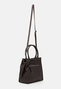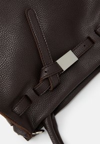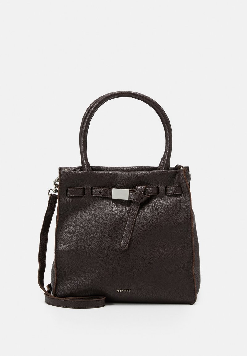 Sac à main en cuir marron foncé texturé avec double poignée, bandoulière décorative avant avec boucle en argent, et bandoulière amovible.