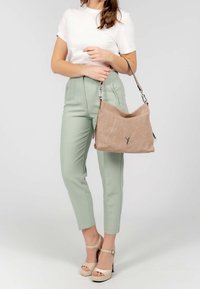 Sac à bandoulière beige texturé avec un dessus ouvert, des accessoires argentés et un logo discret. Le mannequin porte une chemise blanche, un pantalon vert clair et des escarpins crème.