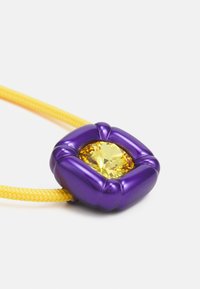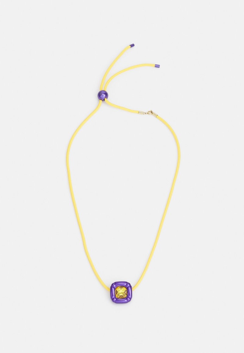 Collier à cordon jaune avec un pendentif carré violet orné d'une gemme jaune, et une fermeture à perle violette ajustable.