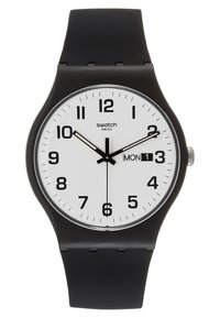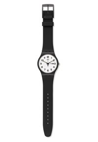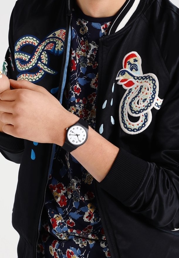 Personne portant une veste noire avec des serpents brodés et une chemise bleue à fleurs, montrant une montre noire avec un cadran blanc à son poignet.