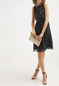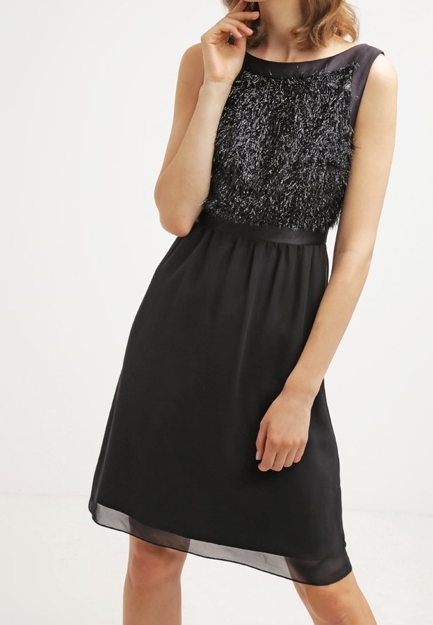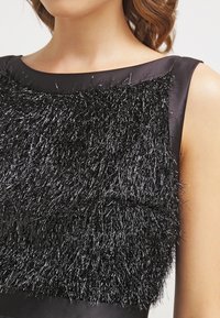 Robe noire avec un buste texturé et pailleté, taille cintrée et jupe fluide. Modèle sans manches avec un col rond classique.
