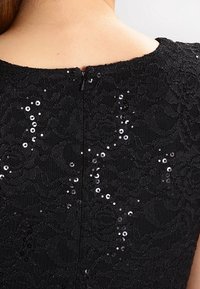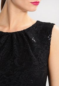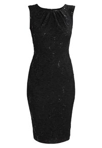 Robe noire en dentelle avec une silhouette ajustée, design sans manches, encolure plissée et détails en sequins partout. Motif floral texturé.