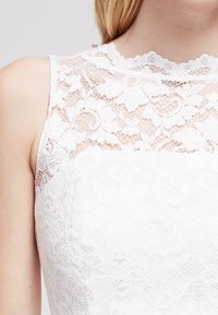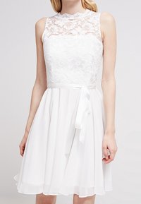 Robe blanche sans manches avec corsage en dentelle, col montant et ceinture ruban nouée à la taille, jupe fluide longueur genou.