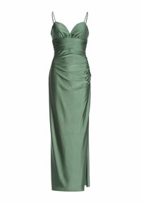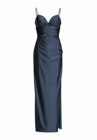 Robe maxi bleu marine en satin avec des bretelles fines, un corsage froncé et une fente sur le côté. Texture lisse avec une coupe ajustée.