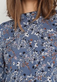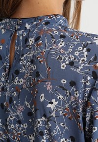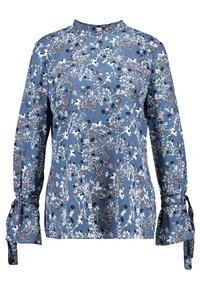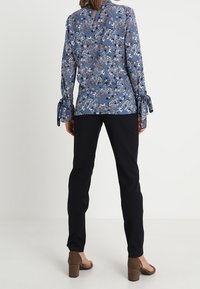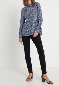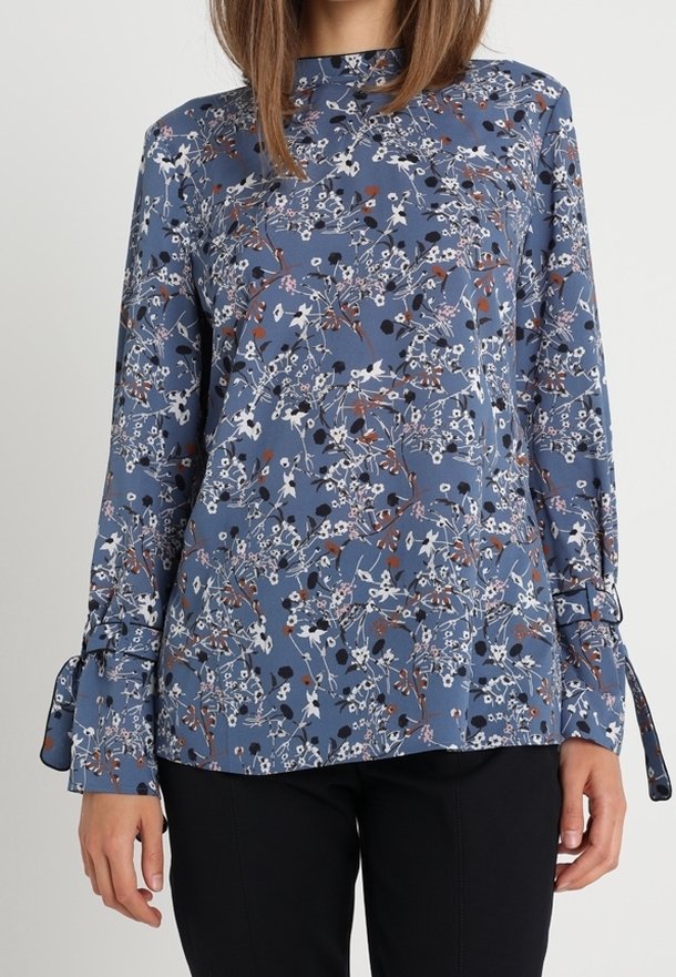 Blouse à manches longues bleue avec imprimé floral blanc, noir et rouille, dotée de détails noués aux poignets, portée avec un pantalon noir.