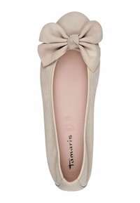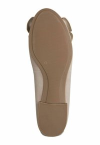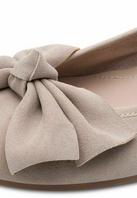 Ballerine beige à bout arrondi, ornée d'un nœud en tissu à l'avant. Texture lisse et talon bas imitation bois.