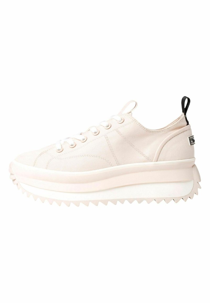 Baskets blanches en toile avec semelle plateforme épaisse, semelle extérieure en caoutchouc texturée présentant un motif en zigzag, et devant à lacets avec languette de tirage noire contrastante.