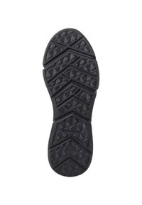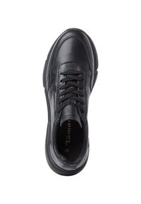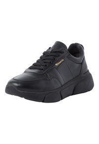 Baskets en cuir noir avec finition texturée et bout rond, dotées de lacets et d'une semelle noire épaisse. Portées avec un pantalon gris raccourci.
