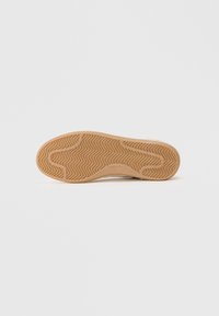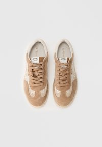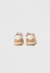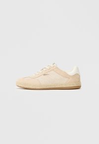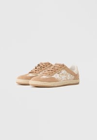 Baskets en suède beige avec broderie florale blanche, semelle intermédiaire en jute texturé et accent en cuir crème lisse au niveau du talon.