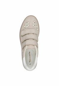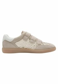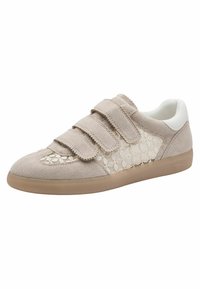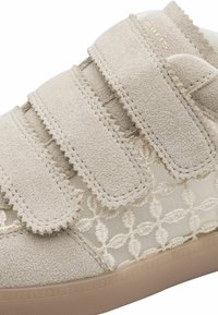 Baskets en daim beige avec un panneau en mesh présentant un motif géométrique, fermées par deux bandes velcro, et une semelle en caoutchouc. Accents blancs au niveau du talon.