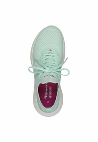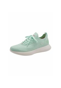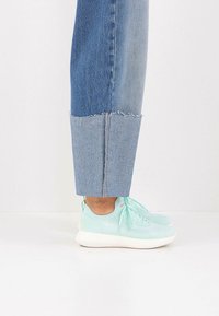 Baskets en maille vert clair avec une finition texturée, dotées de lacets ronds et d'une semelle blanche lisse. Portées avec un jean en denim effiloché.